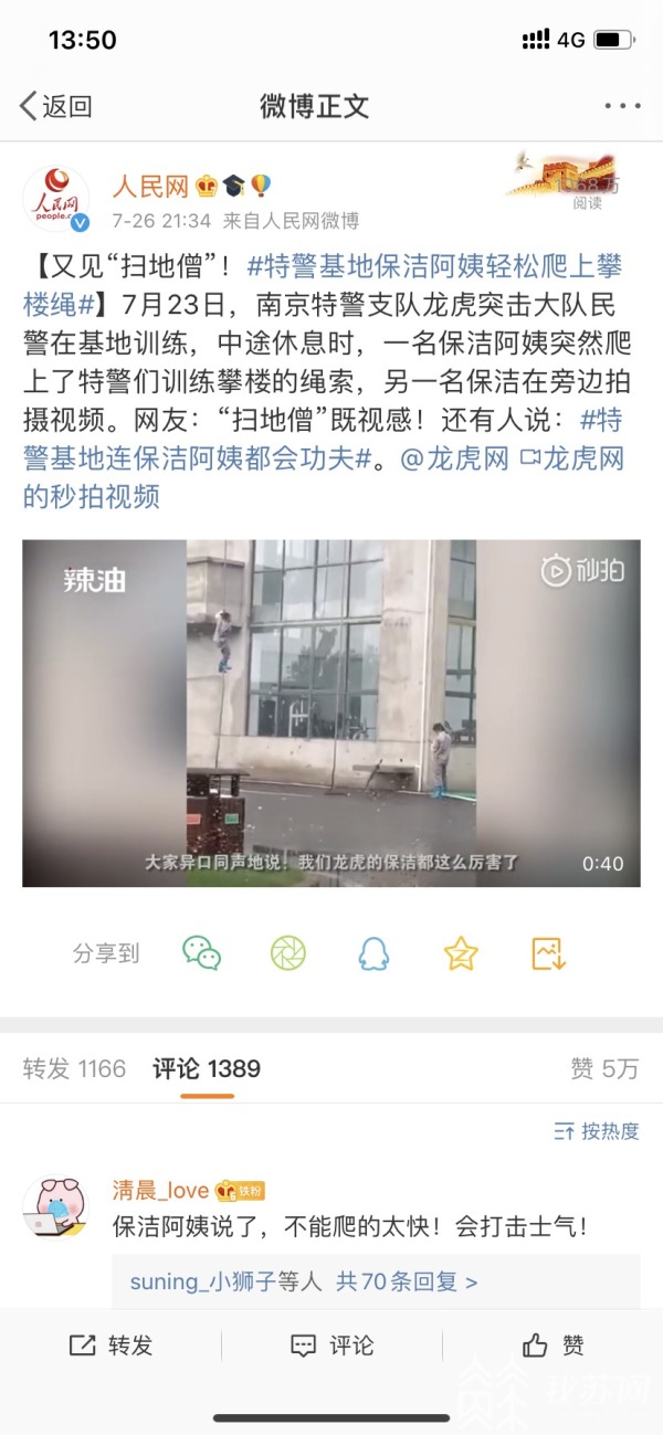 这两天,南京特警训练基地的一位保洁人员,因为一段视频在网上火了起来。视频中,保洁人员正在攀爬特警队员们平时训练的大绳,因为动作敏捷被网友们称为深藏不露的扫地僧。