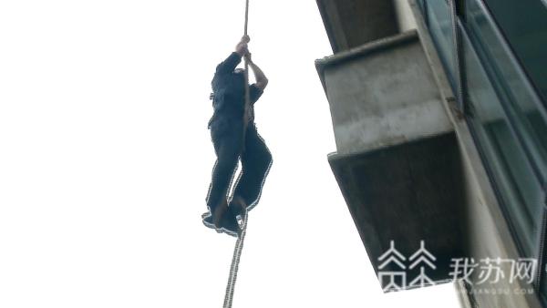 李斌说,攀爬大绳是他们几乎每天都要训练的项目,绳长18米,主要锻炼核心力量。最快的队员可以14秒攀爬18米大绳。不过,没经训练的人能攀爬到2米高很不容易。李斌也注意到,“保洁阿姨”是两腿夹着绳子往上爬,主要靠的是手臂力量。而他们其实是两腿缠绳,靠的是核心和腿部力量。特警队员们都给蒋全文点赞,他们欢迎阿姨锻炼,不过也提醒她不要做高危动作,要保护好自己的安全。