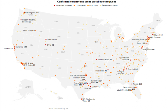 根据统计,与得克萨斯大学奥斯汀分校相关联的病例已经达到449例,中佛罗里达大学有至少438例,佐治亚大学则有390例。虽然统计中的院校来自全美各个地区,但是《纽约时报》仍然表示,还有其他数百所院校、私立大学以及社区学院没有被算进来。即使是统计提到的这些学校,也有很多没有提供患者感染的具体原因、时间以及是否跟某一聚集性疫情有关。