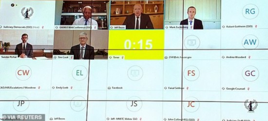 海外网7月30日电当地时间29日,苹果、亚马逊、谷歌和脸书四大科技巨头的首席执行官(CEO)以视频连线方式,出席美国国会众议院听证会。然而这场聚集了科技巨头大佬的会议却因“技术问题”状况百出,亚马逊CEO杰夫·贝佐斯在直播等待期间吃零食被拍,开始发言时又忘记打开麦克风。