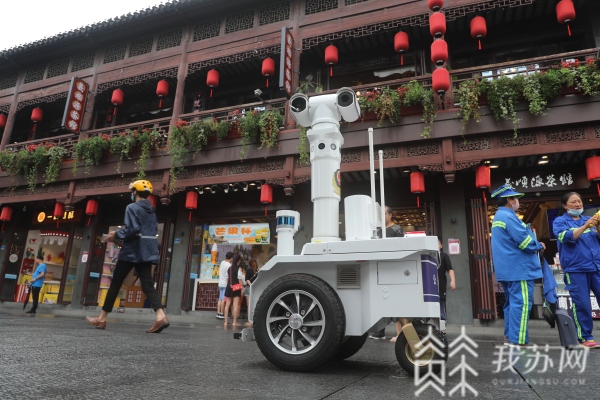 我苏网讯 7月30日,外面飘着小雨, 南京夫子庙5A景区步行街上,一台带有公安标志的机器人引人注目。遇到行人会自动提醒:“欢迎您来到夫子庙,我正在巡逻抓拍,请不要阻挡”。原来这是5G巡逻机器人,在景区来回穿梭。萌萌的“双眼”、长长的“脖子”、交替闪烁的警灯吸引了不少市民的目光。大家对它十分好奇,纷纷拿出手机拍照,小朋友们更是把它当成炫酷大玩具,忍不住驻足围观。