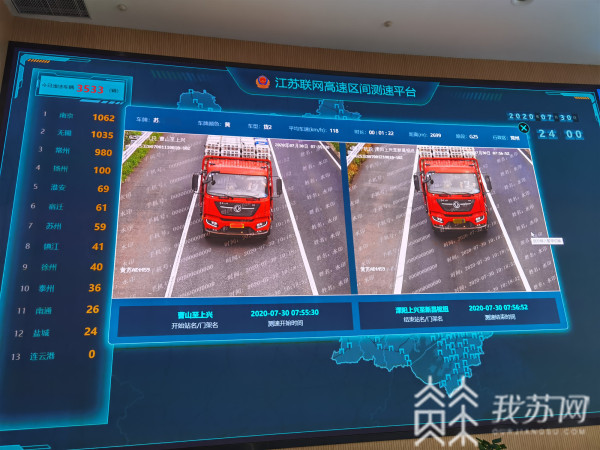 省公安厅交警总队高速支队政委孙卫宁介绍,区间测速的技术对接目前已基本结束,全省在31条高速公路共设置启用778套区间测速设备,基本覆盖了全省联网高速公路全路网,各条高速公路设置的区间测速设备所在的点位桩号以及数量,已于7月27日在“江苏交警”微信公众号向社会公布。针对区间测速的处罚原理,孙卫宁举例说道:“上面这张图大家可以看到,这两个门之间区间是近2.7公里,但是他的通过时间是1分22秒,从平均数值来看时速是118公里,大货车限速最高是100公里,所以这辆车我们认定他超速。”