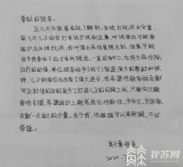 扬州支队政府专职消防员吴天勇一直想参加抗洪抢险任务,但考虑到母亲重病无人照料,内心一直在纠结。母亲得知后主动向组织呈递“请战书”,申请将儿子送上救援一线,希望儿子放下顾虑、报效国家,用实际行动为抗洪抢险贡献力量。