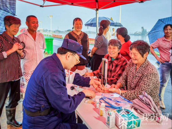 每到傍晚,堤坝帐篷前群众都会排起长队,有测量血压心律的、有问诊寻药的,老人们不时发出喜悦的笑声,为这支边抗洪、边助民的“火焰蓝”队伍竖起大拇指。