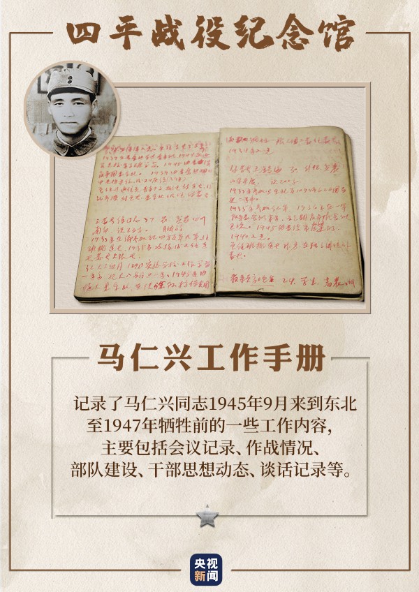 抗战胜利后,马仁兴随部队来到东北,并在辽吉战场上屡建战功。这本工作手册记录了马仁兴当时的工作情况,其中不仅有他对攻坚战术的研究心得、精心绘制的作战地图、阻击敌人的平面图,还记载了141名干部的名字、出身、文化程度、性格特点等个人情况。马仁兴常说:“干部的具体工作就是爱兵。”工作中他知人善用,为部队培养了大批优秀干部。