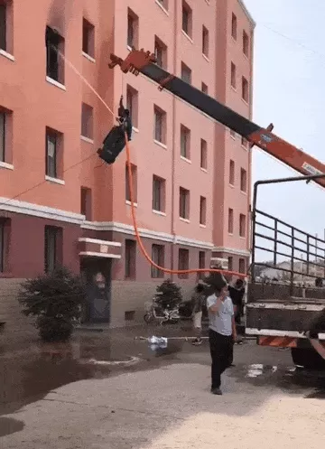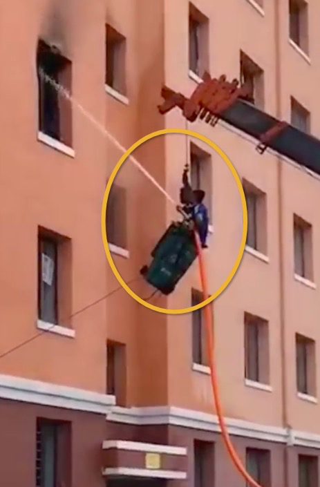 要怎么上去呢?张侠马上和物业商量找来一台吊车看到旁边有个垃圾桶张侠灵机一动用绳子把垃圾箱拴在吊车车臂上自己也顾不得垃圾桶脏臭直接跳了进去 吊车把他运送到三楼窗外很快就把明火扑灭了随后,消防人员也赶到现场扑灭余火并进行现场排烟