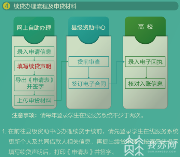 对于今年首次申请贷款的考生,先登录国家开发银行学生在线服务系统完成注册。在8月1号——9月30号之间,携带申贷材料去户籍所在地县级资助中心办理手续。第一步登录国家开发银行学生在线服务系统,完成注册并填写个人及共同借款人基本信息,提出贷款申请并导出《贷款申请表》。系统将提示未通过预申请的同学,还需填写《家庭经济困难学生认定表》。第二步在贷款正式受理期间,贷款学生与共同借款人携带申贷材料,前往户籍所在地县级资助中心办理手续,签署借款合同。“首贷申贷材料,第一个是贷款学生与共同借款人双方的身份证;第二个是录取通知书或学生证;第三个是户口本;第四个是《贷款申请表》;第五个是未通过预申请的还需要《认定表》。持县资助中心提供的《受理证明》前往高校报到,并请高校资助中心老师于10月10日前录入贷款电子回执。”张晓宁说,“从去年开始,国家层面就已经全面取消了办理助学贷款需要提交的困难证明盖章的要求,考生在申请时不用四处盖章。”