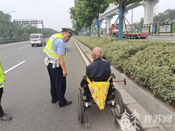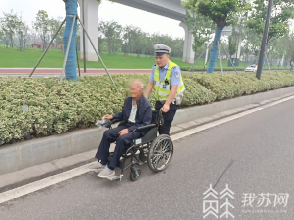 7月30日下午16时30分许,正在江北大道巡逻的南京市公安局江北新区分局交警支队二大队民警詹磊,看见一乘坐电动轮椅的老大爷独自穿梭在车流较大的江北快速路上,身旁不时有车辆快速驶过,此时又临近晚高峰,非常危险。詹磊见状,立即上前拦住老大爷。