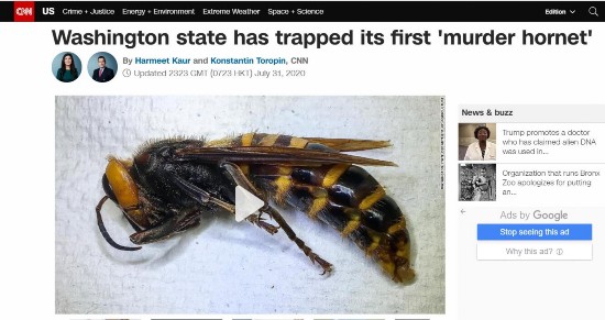 CNN说,自从去年12月首次在华盛顿州发现这种昆虫入侵以来,科学家们一直在努力进行捕捉。截止目前,该州已发现5只“杀手大黄蜂”。根据华盛顿州立大学专家的说法,它们身长超过2英寸(5厘米),是世界上最大的黄蜂,如果被其毒刺多次刺中,可导致人类死亡。