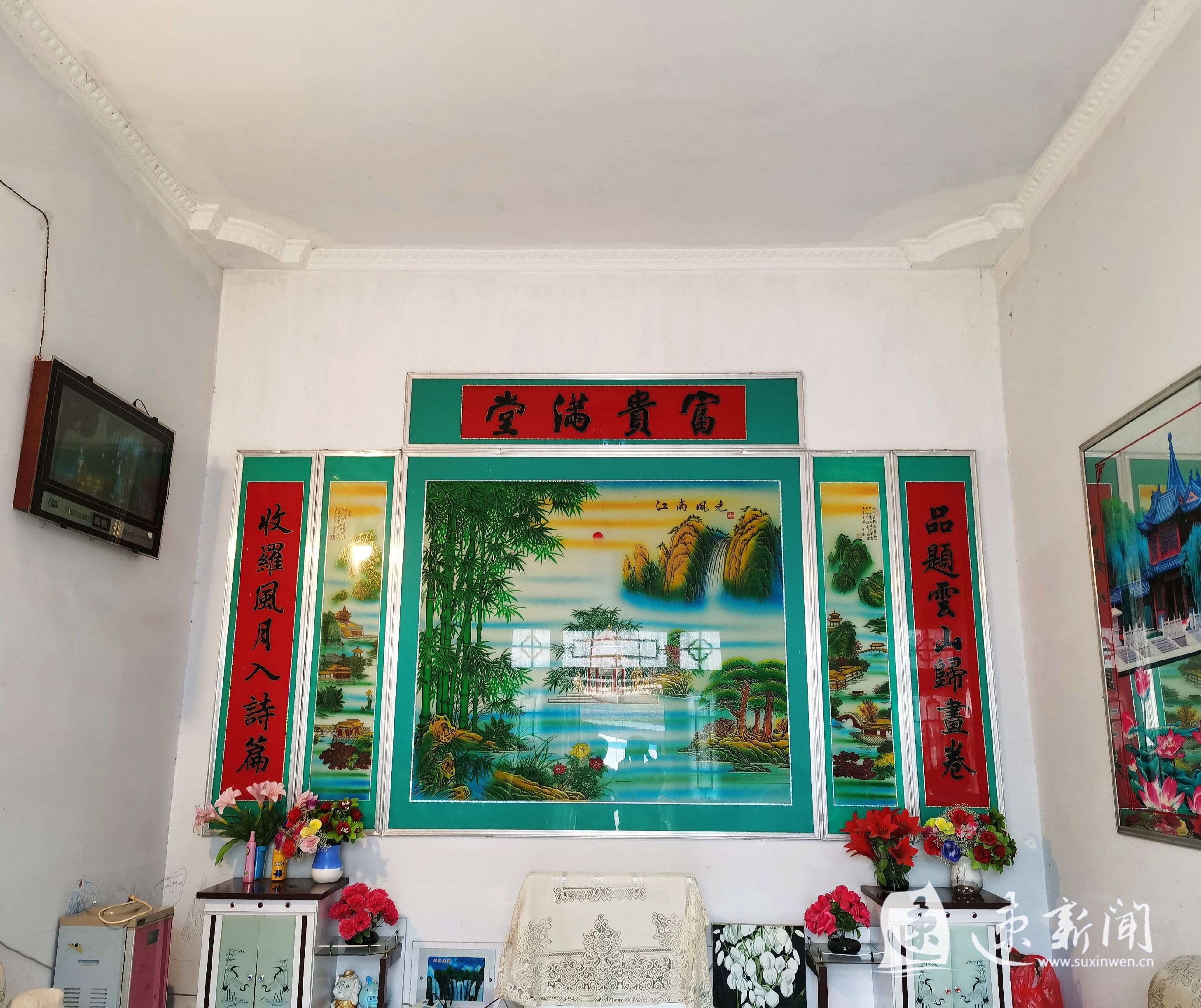 进入朱翠华家的庭院,首先映入眼帘的就是枣树、柿子树和李子树。除了这些体积较大的果树,还有许多花花草草,茂盛却不显杂乱,衬得整个庭院充满生机。家中客厅和几间卧室内,物品摆放整齐,虽然有的上了年头但也被擦拭得干干净净,充满年代感的装修风格简单明朗。客厅的中堂上写着“题品云山归画卷,收罗风月入诗篇”的对联,透露出这一家人对于美好生活的追求和向往。