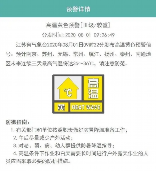 江苏省气象台2020年08月01日09时22分发布高温黄色预警信号:预计南京、苏州、无锡、常州、镇江、扬州、泰州、南通地区未来连续三天最高气温将达35~36℃,请注意防范。