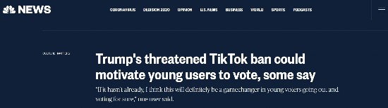 但特朗普却表示将禁用这款短视频分享App,因此许多接受NBC采访的TikTok用户表示这促使他们将在今年11月首次进行投票。有人表示,如果特朗普真的禁了TikTok,这可能会导致很多年轻TikTok用户在11月的总统大选中投票反对他。