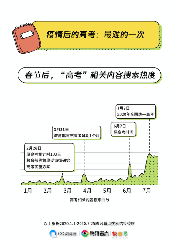 2月底教育部宣布将审慎研究制定今年高考实施方案后,“高考”相关内容搜索就持续走高。搜索曲线在7月7日到达最高点,随后热度一直居高不下。