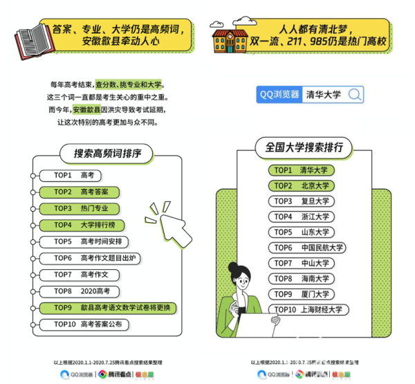 根据《报告》,和往年一样,答案、专业、大学等关键词排在搜索高频词前列,今年受洪灾影响,安徽歙县的高考推迟和试卷更换成为热点话题,位于搜索高频词排行第九。清华大学和北京大学稳居全国大学搜索排行前两位。