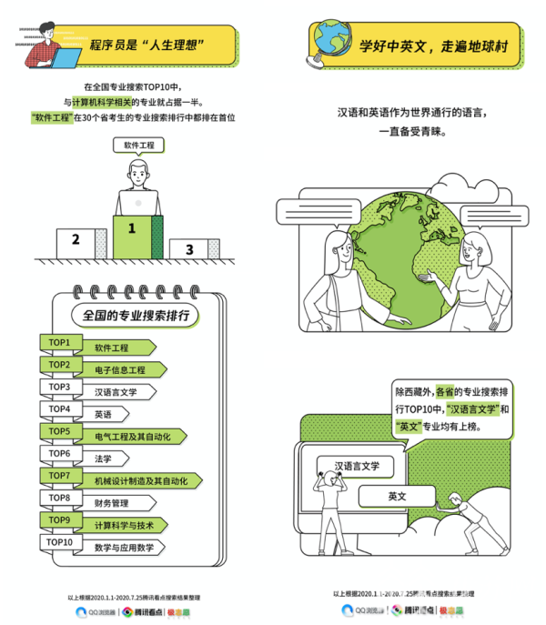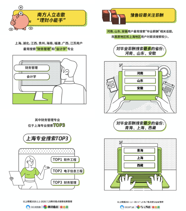 日前,腾讯看点发布了《2020年高考搜索大数据报告》,《报告》显示,高考搜索热度持续升高,计算机、语言相关专业最受关注;各省用户普遍关注省内高校,云贵桂宁用户偏爱师范、医科类专门院校;南方人更关注财务会计类专业,豫鲁皖最关注毕业薪酬。