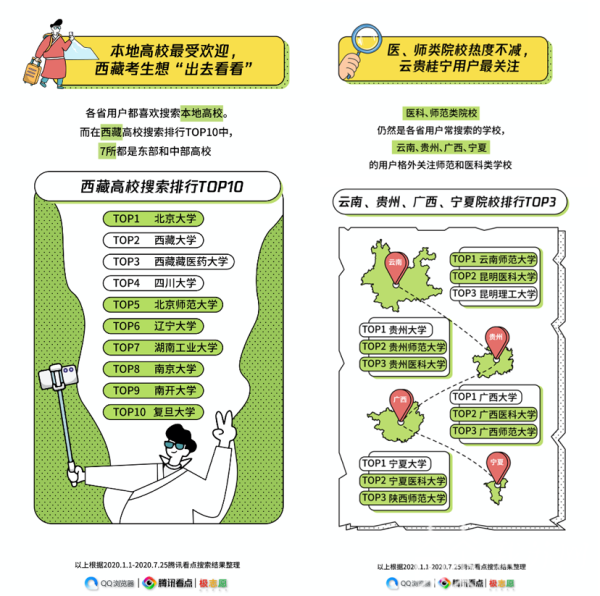 根据腾讯看点的搜索数据,全国各省用户更关注本地高校。而西藏考生更想“出去看看”,西藏院校搜索排行TOP10中仅2所位于省内,其余7所位于东部和中部地区,1所位于四川省。
