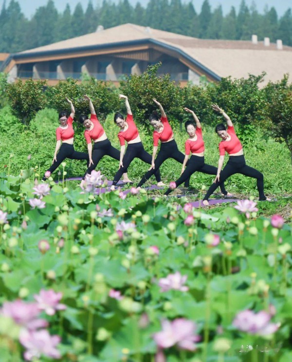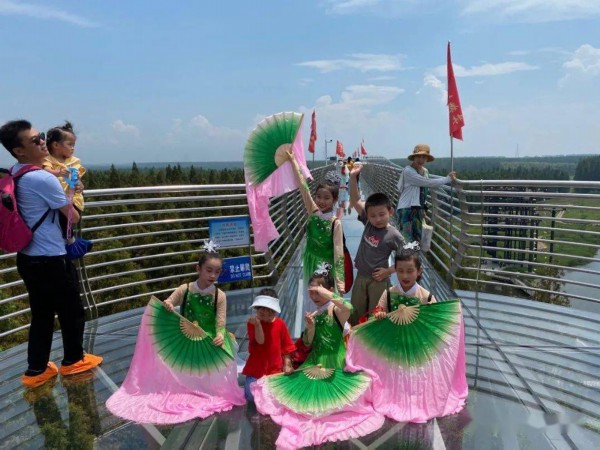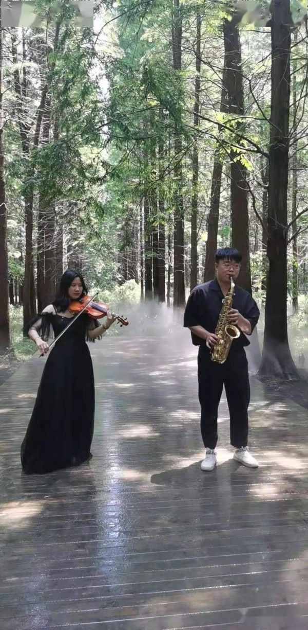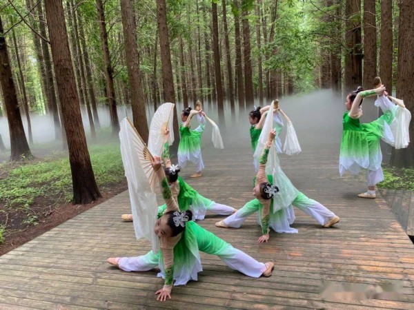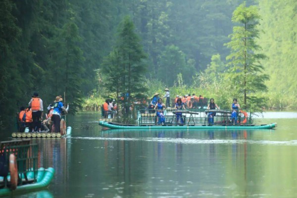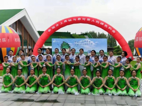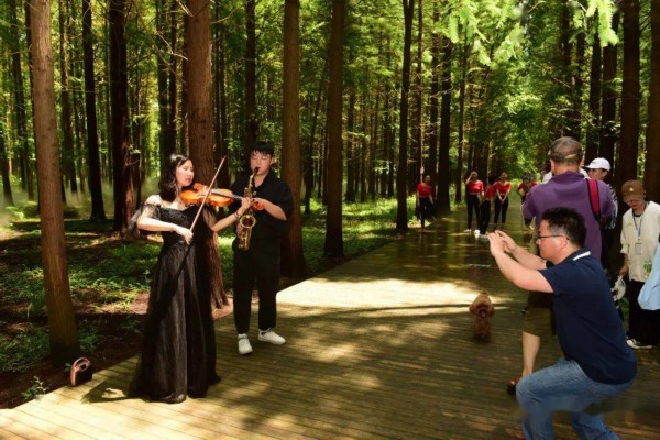 游 客们在欣赏着音乐表演的同时还观赏着水中的荷花,池中的杉树,路边的格桑花,体验着不同的游玩项目,洗着森林的负氧离子浴。