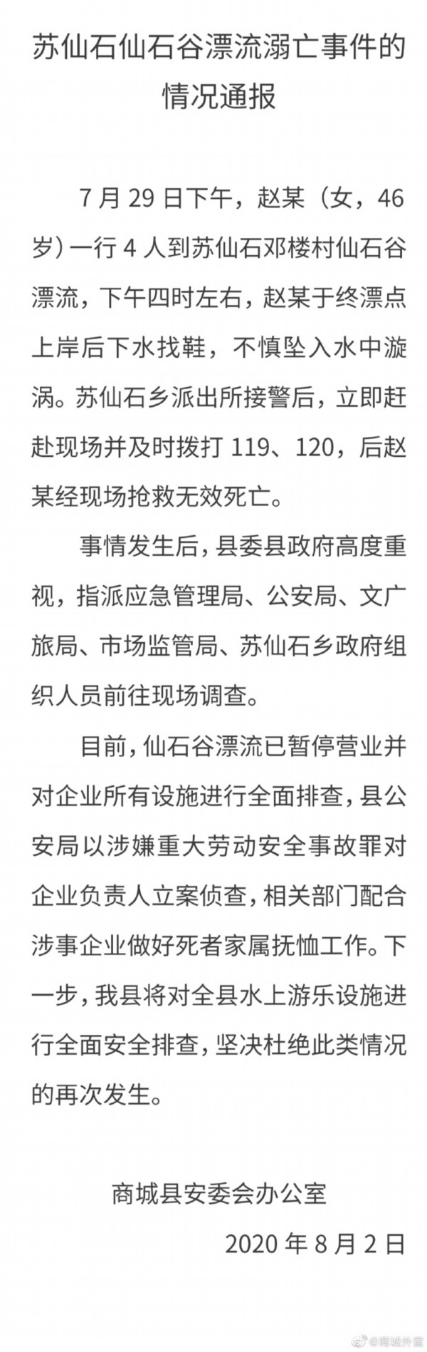 荔枝新闻讯 8月2日,河南省信阳市商城县新闻中心官方微博@商城外宣 发布了关于苏仙石仙石谷漂流溺亡事件的情况通报。