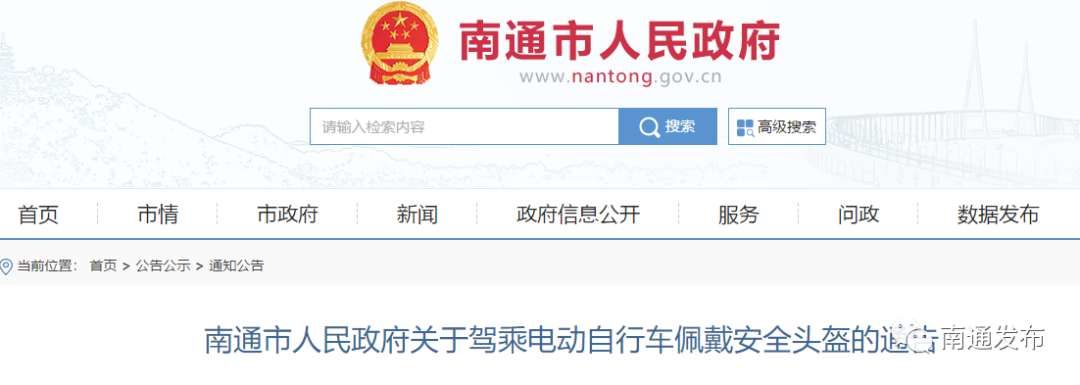 南通市政府网刚刚发布《南通市人民政府关于驾乘电动自行车佩戴安全头盔的通告》: