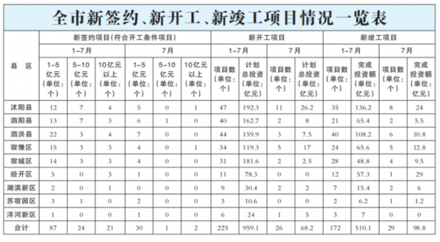 重大项目建设如火如荼,企业车间开足马力生产,工业产品令人目不暇接……炎炎夏日,宿迁大地处处热气腾腾、热流涌动,呈现比学赶超、竞相发展的喜人景象。数据显示,7月份,全市新开工项目26个,计划总投资68.2亿元;新竣工项目29个,完成投资98.8亿元。
