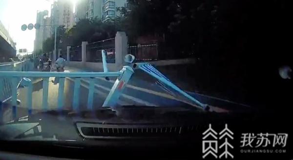 行车记录仪画面显示:这辆轿车在右转弯时突然撞向了路边的交通护栏,冲破护栏后,轿车继续向前行驶,在撞上路边一处小区的围墙后才停了下来。