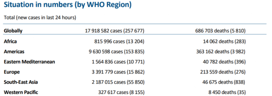 当地时间8月3日,世卫组织发布最新一期新冠肺炎每日疫情报告,全球新冠肺炎新增257677例,死亡新增5810例。疫情最为严重的美洲区域确诊病例达到9630598例(新增153835例),死亡363162例(新增3982例)。