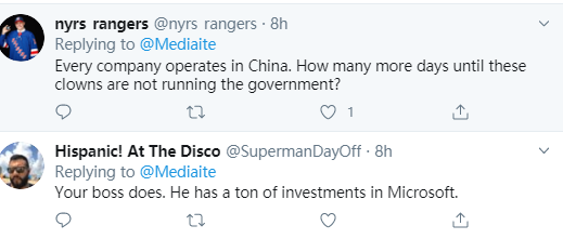 有人更一阵见血地质问说,按照纳瓦罗这套逻辑,那恐怕许多在中国有业务的美国公司都在“通中”了,那你的老板特朗普的家族在中国也有不少业务,还投资了微软呢,是不是他也“通中”呢?