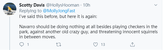 还有美国网民认为,像纳瓦罗这样的老疯子,只适合去公园里和其他老疯子下下棋,然后威胁威胁路过的松鼠……