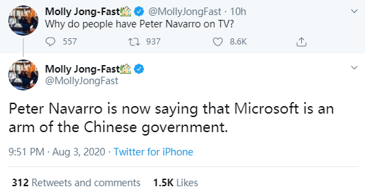 比如下面这位来自美国《每日野兽》网站的编辑就无法理解为什么CNN还要采访纳瓦罗这种能把微软公司说成是中国政府一部分的人。