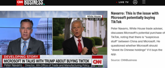 之后,这位美国白宫里最狂热的“冷战分子”,又开始攻击起准备收购TikTok业务的微软公司,暗示这家美国公司私通中国,只是他的逻辑更加荒诞且缺乏依据。