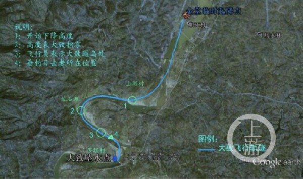 经现场勘察,结合目击者和救援人员拍摄的视频、图片综合判断,该机坠机点位于金堂县淮口镇罗坝村附近的沱江江面,距金堂起降点跑道中心点206度大约6.2公里处,在坠江点上游约100米处有一条东西走向跨江滑索。飞机坠水后,机体完整,机身朝上,浮于水面,座舱顶盖上及左机翼缠绕钢缆。