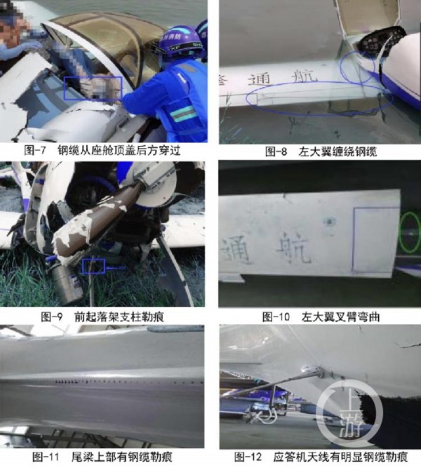 救援过程中,救援人员为救援机上人员剪断钢缆,打开座舱顶盖。经现场勘察,坠江飞机两片螺旋桨折断、发动机整流罩破损,机身大梁从座椅后侧裂开,钢缆从座舱顶盖后方穿过,驾驶舱内GPS定位仪遗失。