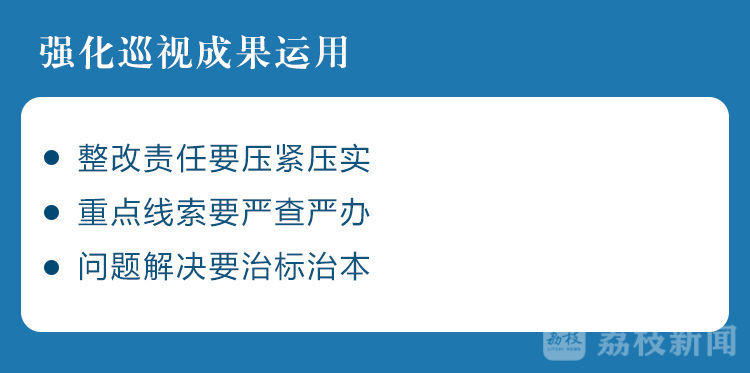 会议指出,要强化巡视成果运用,扎实做好巡视“后半篇文章”。整改责任要压紧压实,指导被巡视单位列出任务清单、责任清单,逐项盘点、对账销号,对敷衍整改、虚假整改甚至边改边犯的要严肃问责。重点线索要严查严办,对违纪违法行为坚决查处、绝不姑息,做到移交一批、查处一批、警示一批。问题解决要治标治本,从推动治理现代化的高度,举一反三、对症下药,抓紧完善制度机制,更好实现常态长效。