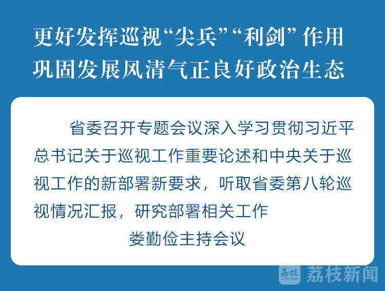 荔枝新闻讯 8月3日,省委召开专题会议,深入学习贯彻习近平总书记关于巡视工作重要论述和中央关于巡视工作的新部署新要求,听取省委第八轮巡视情况汇报,研究部署相关工作。会议强调,要进一步深化全面从严治党,更好发挥巡视“尖兵”和“利剑”作用,扎实做好巡视“后半篇文章”,不断巩固发展风清气正的良好政治生态。