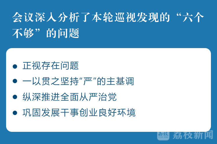 会议认为,在疫情防控常态化背景下开展的省委第八轮巡视,紧扣落实“六稳”“六保”任务这条主线,紧盯省级机关履职尽责这个重点,紧跟疫情防控和巡视工作“两手抓”这一要求,对全省夺取疫情防控和经济社会发展“双胜利”起到了积极推动作用。会议深入分析了本轮巡视发现的“六个不够”的问题,强调要正视存在问题,一以贯之坚持“严”的主基调,以永远在路上的坚韧和执着纵深推进全面从严治党,更富成效地巩固发展干事创业良好环境。