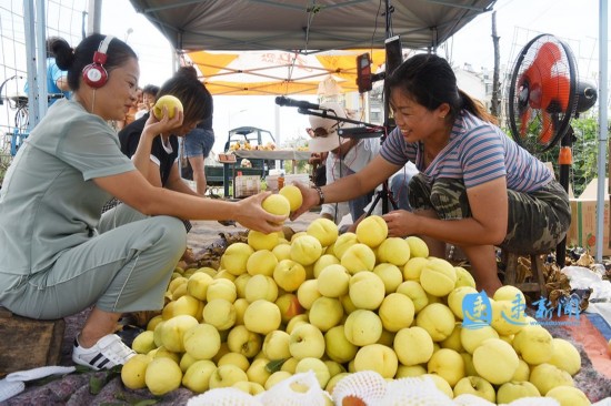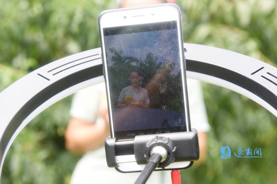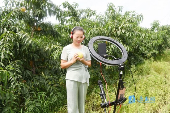 8月4日,宿迁市泗洪县孙园镇青年农民刘秋莲,利用网络直播平台在田头销售黄桃。