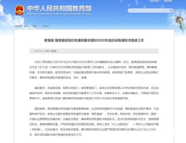近日,教育部和国家邮政局联合印发《关于进一步做好2020年高校录取通知书寄递工作的通知》,从规范寄递管理、确保精准投递、做好防疫消杀等方面对各地教育、邮政等部门和高校、邮政企业提出明确工作要求,确保录取通知书寄递的安全、及时、准确。