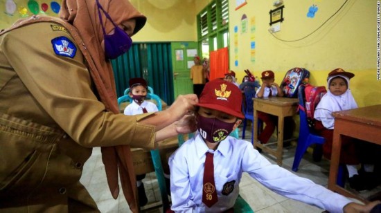 一位印度老师在为学生固定口罩(美国有线电视新闻网)