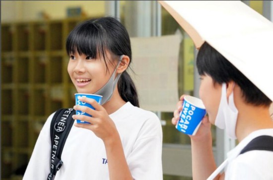 在“饮料吧”补充水分的学生。(图片来源:《朝日新闻》)