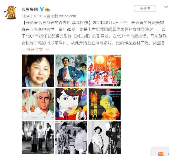 荔枝新闻讯 据长影集团微博消息,2020年8月4日下午,长影著名导演姜树森在长春家中去世,享年90岁,她是上世纪我国颇具代表性的女性导演之一,曾于1961年担任长影经典影片《刘三姐》的副导演,在1971年与武兆堤、马尔路联合执导了电影《沙家浜》,从此开始独立执导影片。她的作品题材广泛,类型各异。其中,反映改革开放初期社会面貌的《残雪》《花园街五号》《赤橙黄绿青蓝紫》《女人的力量》等一系列现实题材影片,上映后均引发了较大的社会反响。