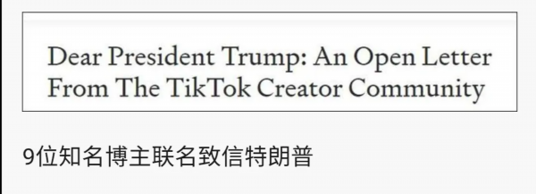 TikTok在美国仍然生死未卜,但美国大V们已经看不下去了。《纽约时报》报道称,包括Brittany Broski和Hope Schwing等在内的多位TikTok大V,联名向美国总统特朗普发表了一封公开信。这些粉丝数加起来超过5400万人的大V们在信中呼吁:要让资本来解决TikTok的问题,而不是国家干预。