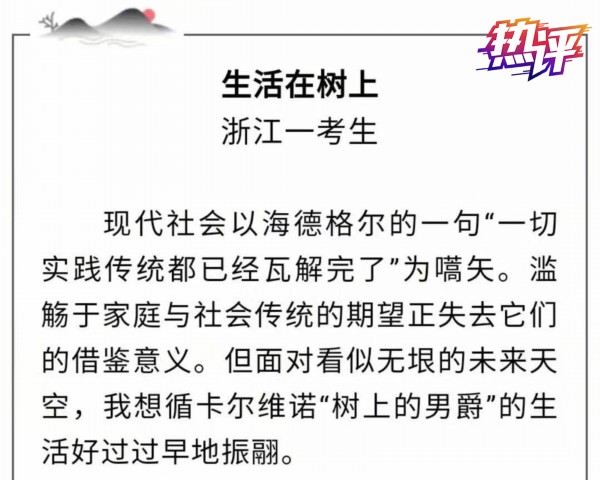 以上语句来自于一篇名为《生活在树上》的浙江省2020年高考满分作文。据媒体报道,浙江省高考作文阅卷大组教授点评文章称“老到和晦涩同在,思维的深刻与稳当俱备”。
