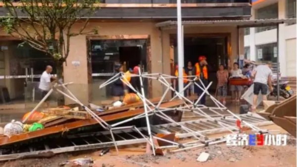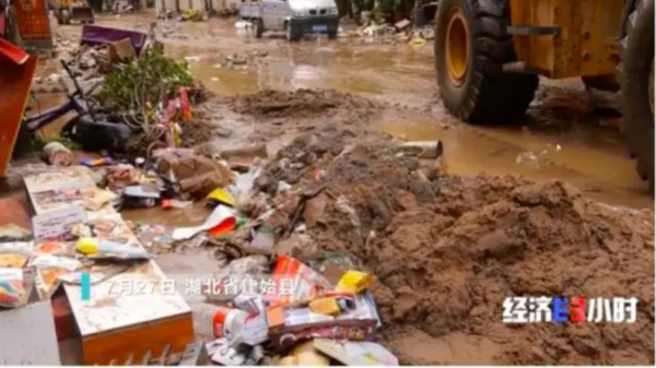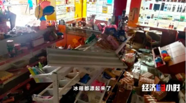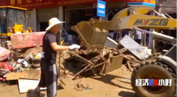 游映红是一家小超市的老板,暴雨当天,她的店铺被淹,损失惨重。洪水刚一退,游映红便立刻开始清淤,从店内清出来一小部分商品,但大部分都已经损毁了。
