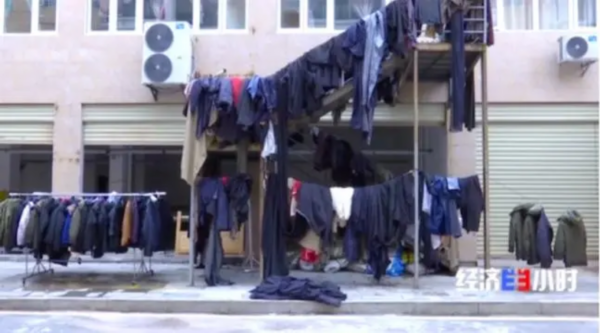 这几天,服装厂正在进行清淤工程,员工也将浸泡在洪水中的5300条裤子和1000多件羽绒服清洗之后晾晒。