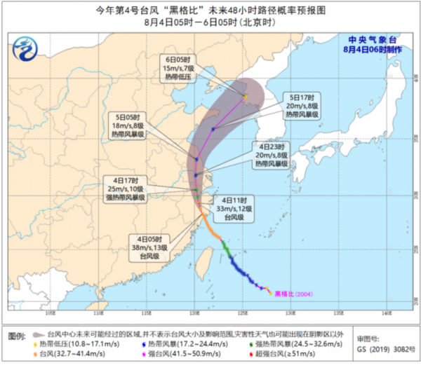 4日上午10时,中央气象台发布台风黄色预警。预计,“黑格比”将向偏北方向移动,强度逐渐减弱,将穿过浙江中北部和江苏中南部并于5日上午从江苏中部移入黄海,向朝鲜半岛西部沿海靠近。