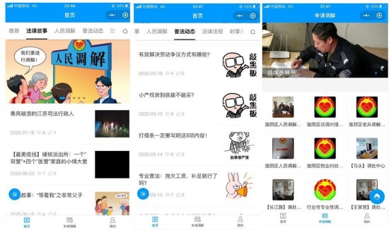 这款“小程序”设置了法律故事、人民调解、普法宣传、法律法规、大飞说法等专栏,用户只需通过关注淮阴人民调解公众号或搜索附近小程序、扫描小程序二维码,即可在线与后台工作人员交流,还可在线选定自己认可的调解员参与矛盾纠纷调处。