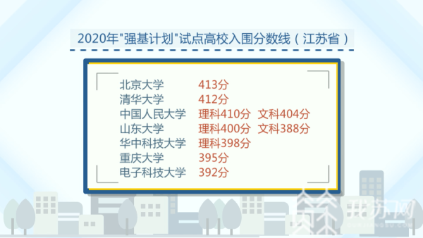 "强基计划"分省录取,招生院校以省(市、自治区)为单位,分别划定入围分数线。北京大学"强基计划"在江苏省的入围分数线为413分,清华大学412分,中国人民大学理科410分,文科404分;山东大学理科400分、文科388分;华中科技大学理科398分,重庆大学395分,电子科技大学392分。