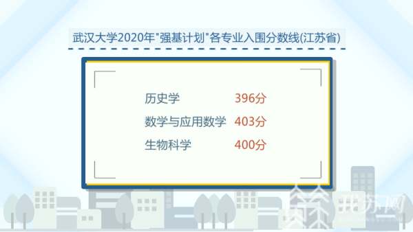 武汉大学、东南大学、哈尔滨工业大学、南开大学、大连理工大学、兰州大学等高校的入围分数线则细分到各个专业,其中,武汉大学在江苏历史学396分,数学与应用数学403分,生物科学400分。