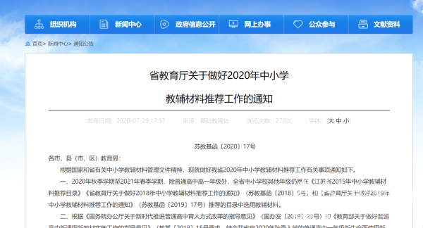 近日,江苏省教育厅下发关于做好2020年中小学教辅材料推荐工作的通知,要求各中小学校从严落实主体责任,按照每门学科"一教一辅"的原则,强调学生自愿,不得超量为学生选用或购买教辅书。