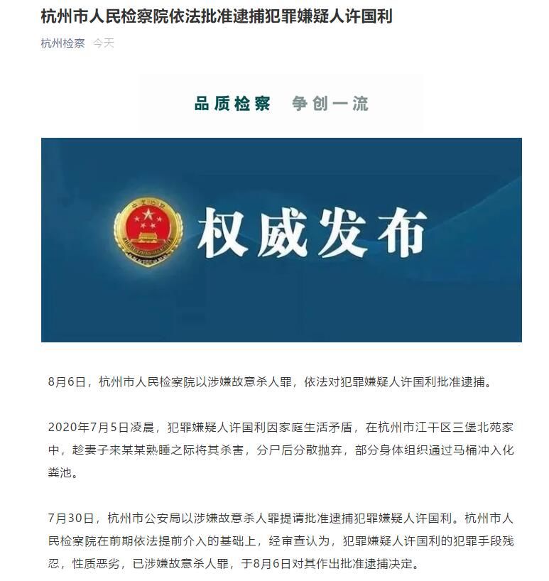 荔枝新闻讯 据杭州检察微信公众号消息,8月6日,杭州市人民检察院以涉嫌故意杀人罪,依法对犯罪嫌疑人许国利批准逮捕。